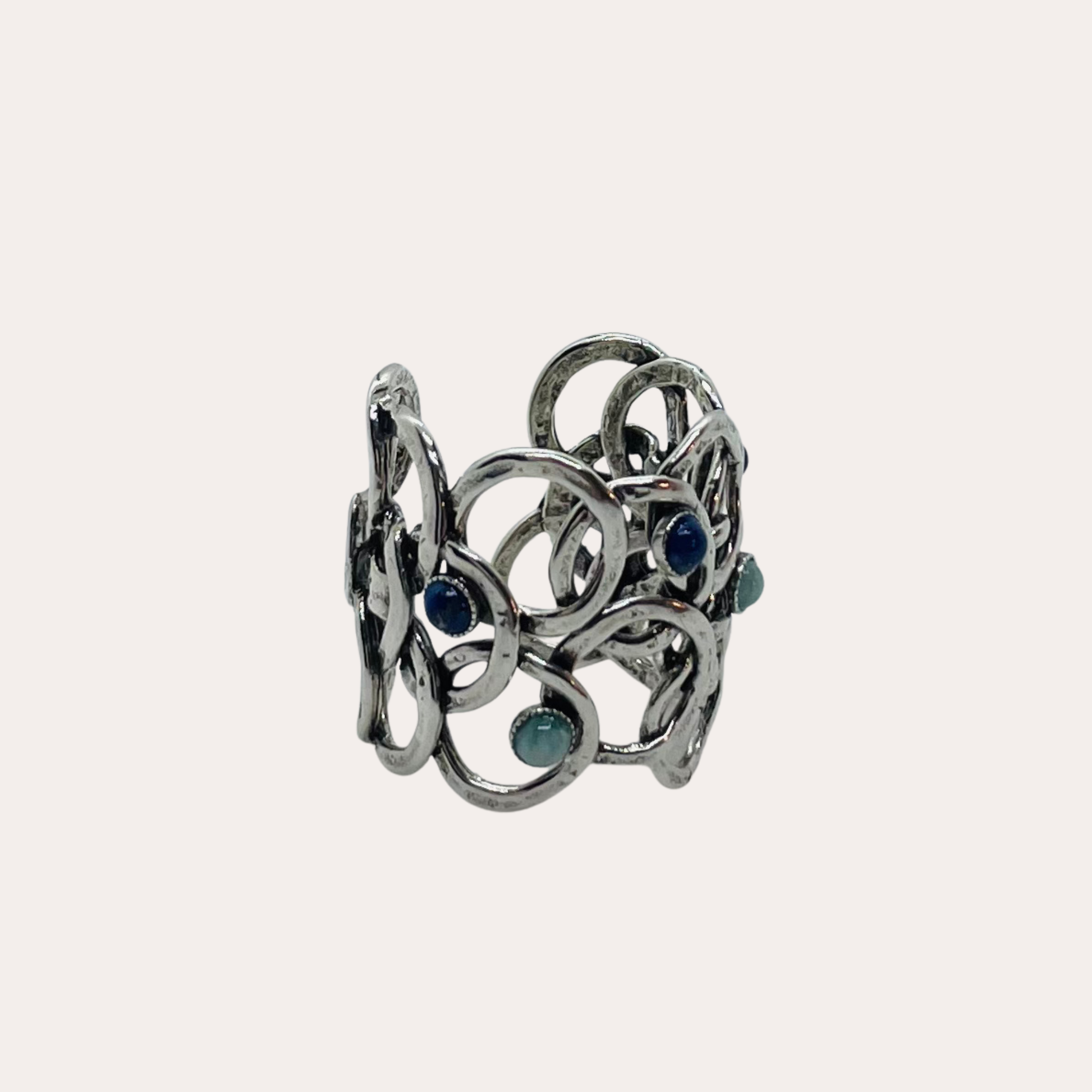 Bague Olympie argentée, réalisée à partir d'une élégante superposition d'anneaux martelés à la main dans notre maison atelier marseillaise et ornée de cabochons bleus. Pièce emblématique, son design texturé et graphique dévoile une élégance solaire.