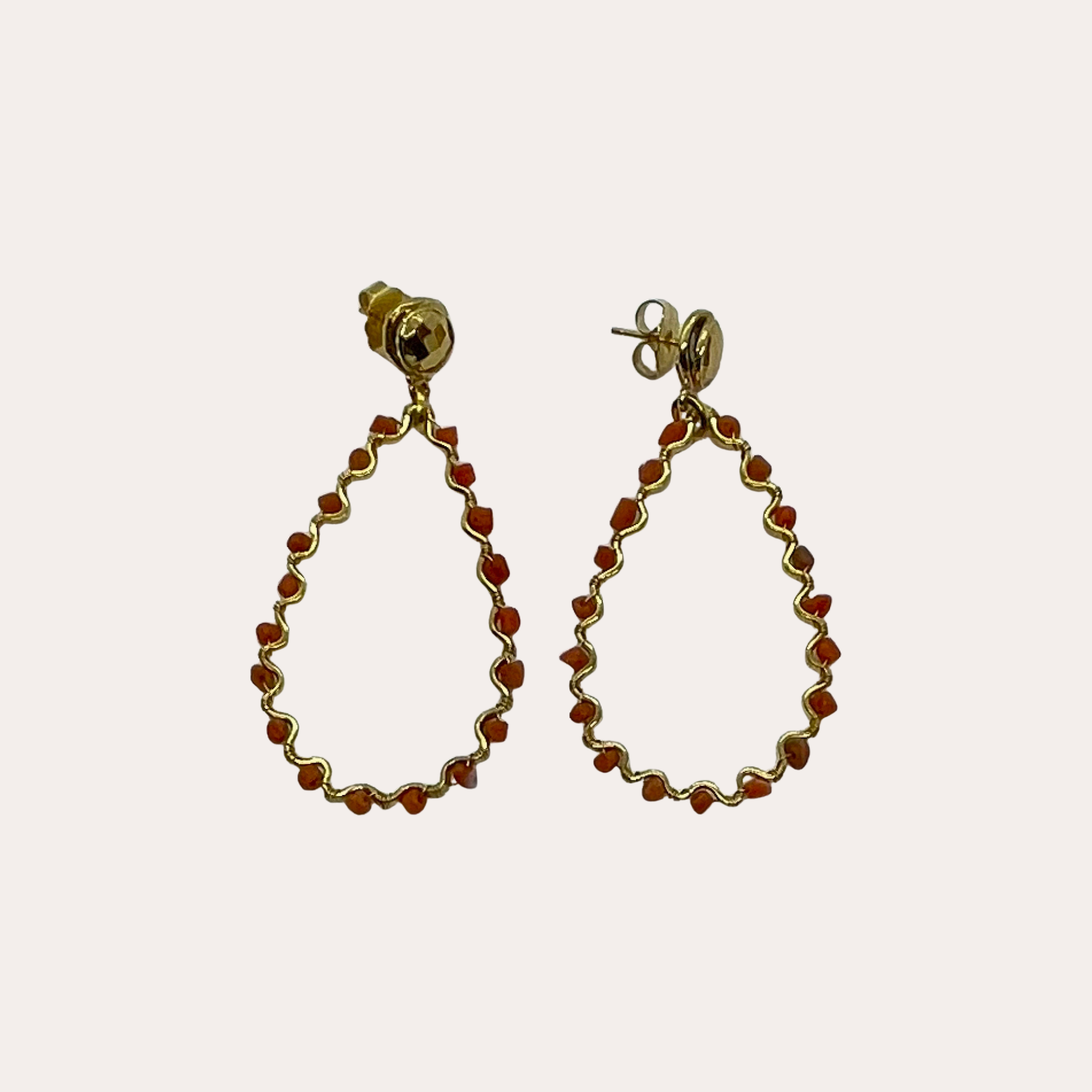 Boucles d'oreilles dorées à l'or fin, forme goutte, habillées de perles couleur corail.