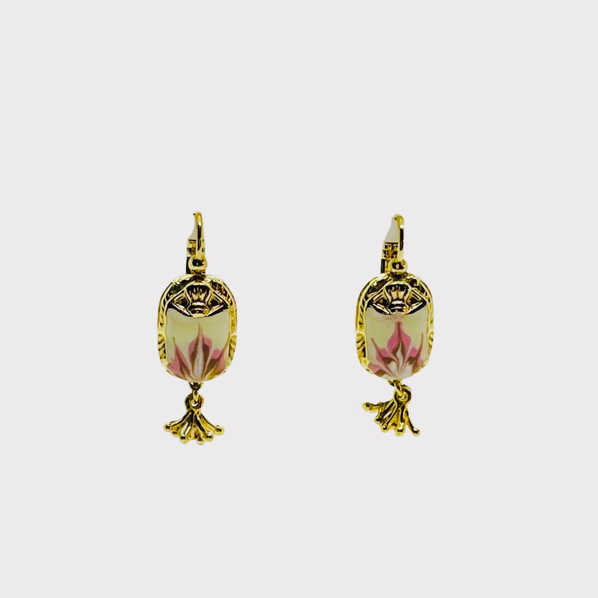 Boucles d'oreilles dorées à l'or fin composées d'un élégant scarabée, gravée et émaillé à la main. Elles sont habillées de fines perles de rocaille.