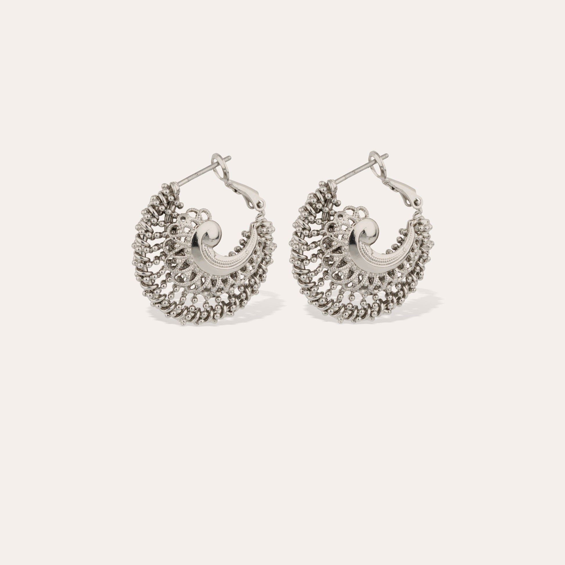 Fines créoles argentées, composées d'une base de fils et perles argentées, et ornées d'une pièce en filigrane.