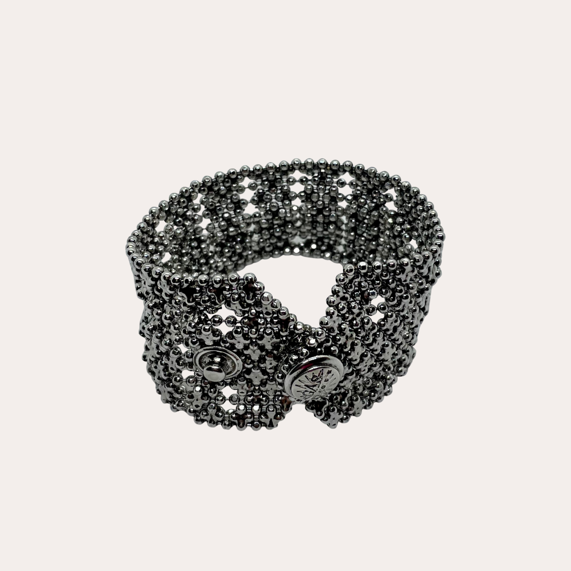 La collection Chamiro dévoile un bracelet manchette argenté à l’élégance délicate. Composé d’un assemblage de fines chaînes , il se ferme par des pressions.