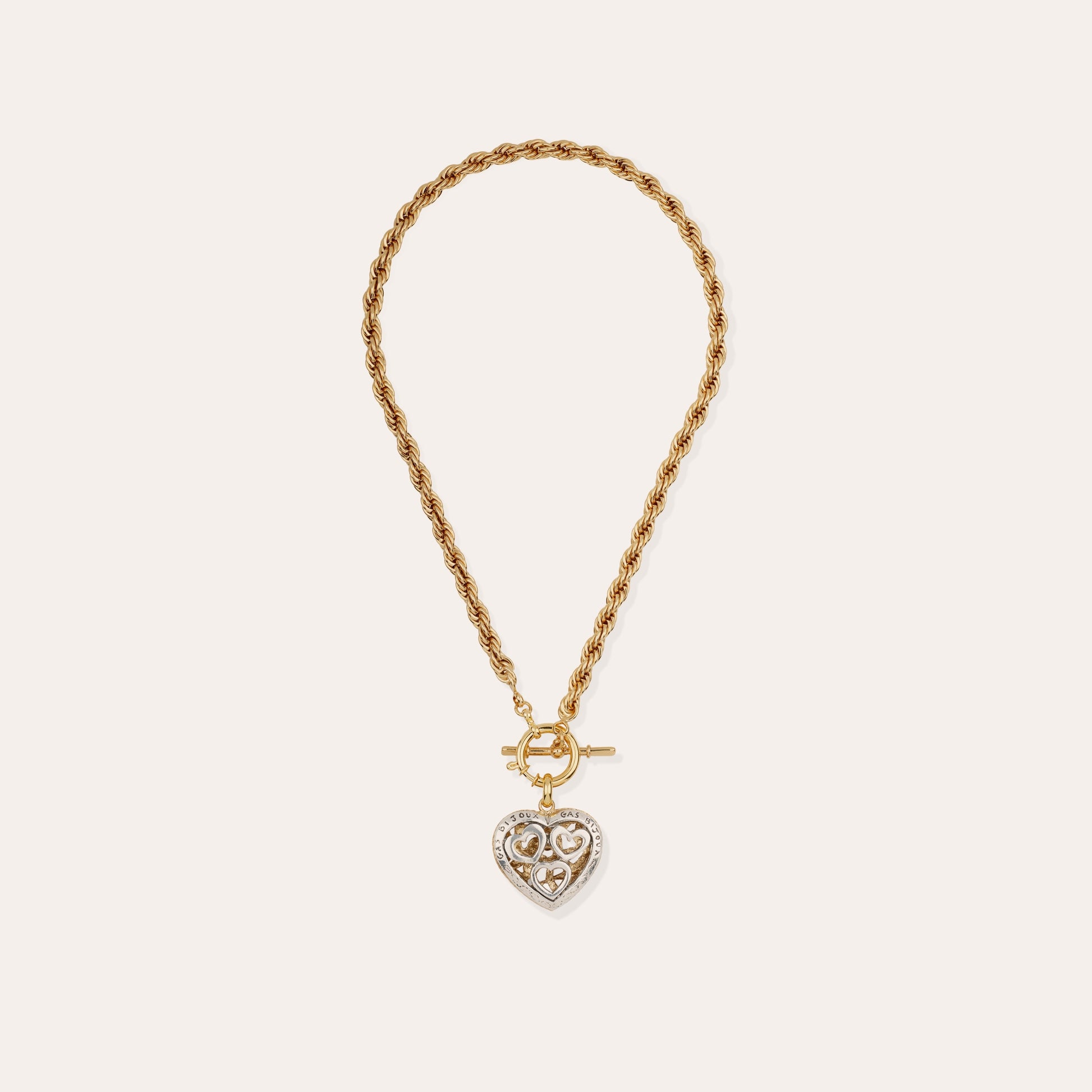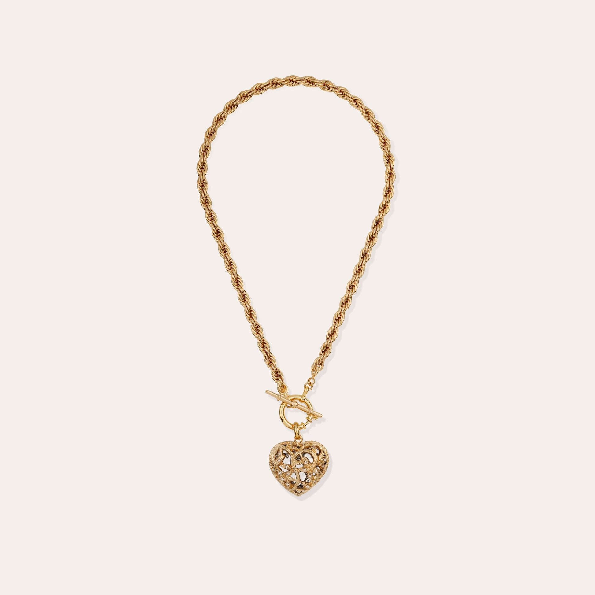 Inspiré d’une création vintage d’André Gas de 1990, ce bijou revisite avec finesse les motifs ajourés des moucharabiehs. Son cœur bombé et filigrané, orné de strass scintillants, dévoile un éclat subtil. Doré à l’or fin et argenté au dos, sa maille torsadée incarne l’équilibre entre retenue et passion. Un fermoir barrette vient sceller cet écrin d’émotions.