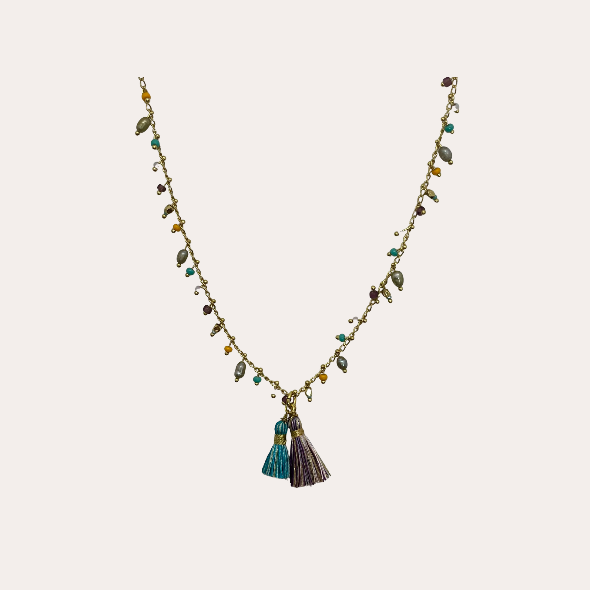 Collier composé d'une chaîne dorée à l'or fin, ornée de perles de rocaille de différentes couleurs.
